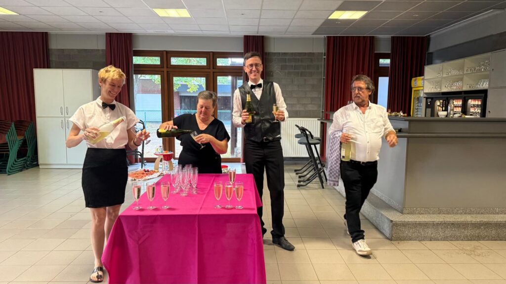 Onze dirigent, zoals altijd een toonbeeld van mededogen (ahum), had geen genade. De repetities waren intens, de noten vlogen ons om de oren, en de vermoeidheid werd vakkundig genegeerd. Maar gelukkig was er een culinair vangnet: onze kook(groot)ouders André en Marleen, bijgestaan door tante Hilde en Mark. En geloof ons, “kookouders” is hier geen eufemisme. André en Marleen zijn de grootouders van onze muzikanten Joanna en Helena, en (schoon)ouders van Tom en Nausikaä. Kortom: een familiezaak met Michelin-ambities. Van ontbijt tot feestmenu: we werden culinair verwend tot in de puntjes.